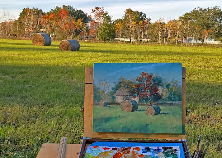 This is a plein-air sketch of hay bales and Tallow trees growing against a fence line. If the truth be known, there really wouldn't be any color in our landscape if it wasn't for the invasive Chinese Tallows and poison ivy vines.